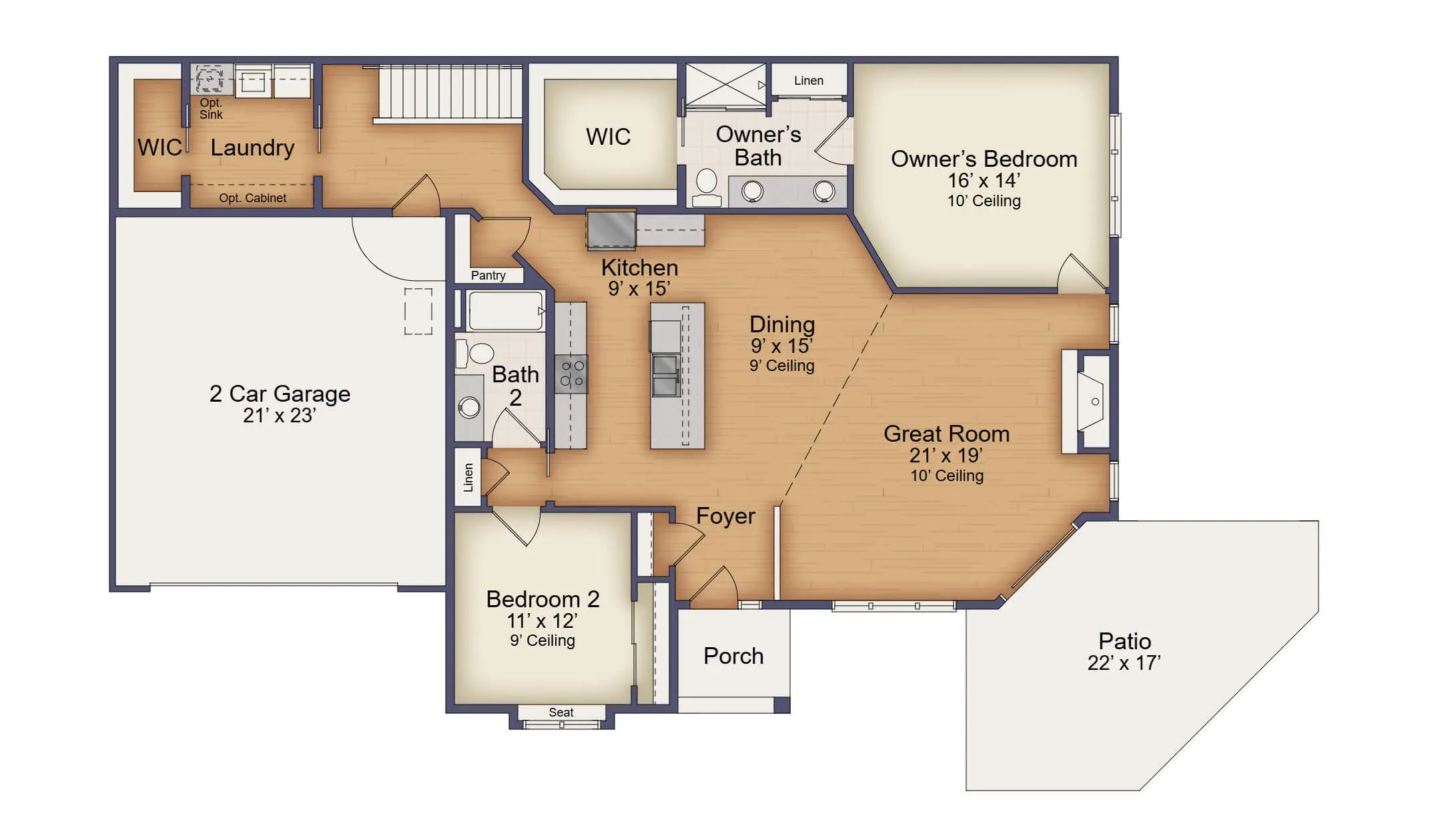 The Bristol gives you the convenience of single-story living along with thoughtfully-planned privacy features. You’ll love the lofty ceilings, 2 bedrooms and 2 full bathrooms, the dine-in kitchen, and deck or patio access from the great room. The large owner’s suite features a walk-in closet and double vanity with full-width mirrors.