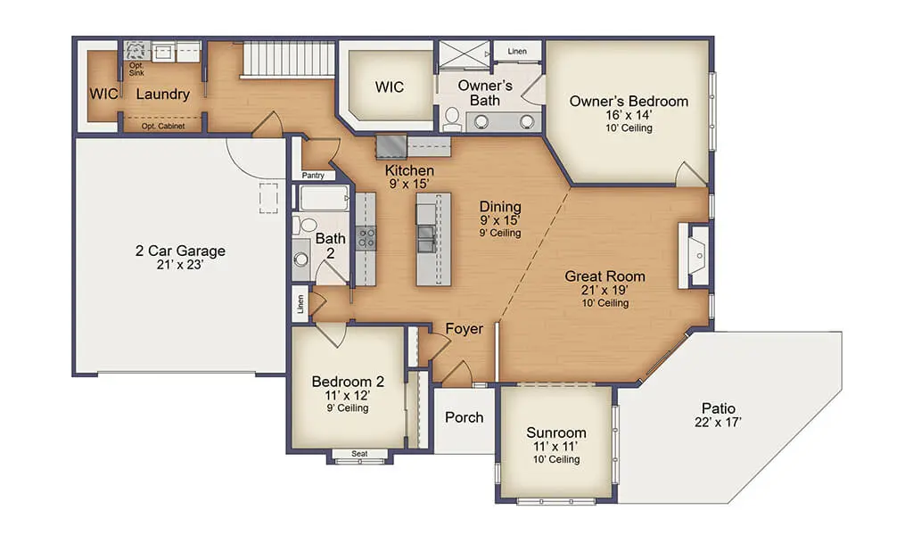 Your Kenzie home is distinguished by gorgeous design elements, including an entry foyer with ceramic flooring and a living room and sun room featuring high ceilings and decorative windows. Enjoy the large owner’s suite and bath. The second bedroom and bathroom feature high ceilings and a tub/shower combination.