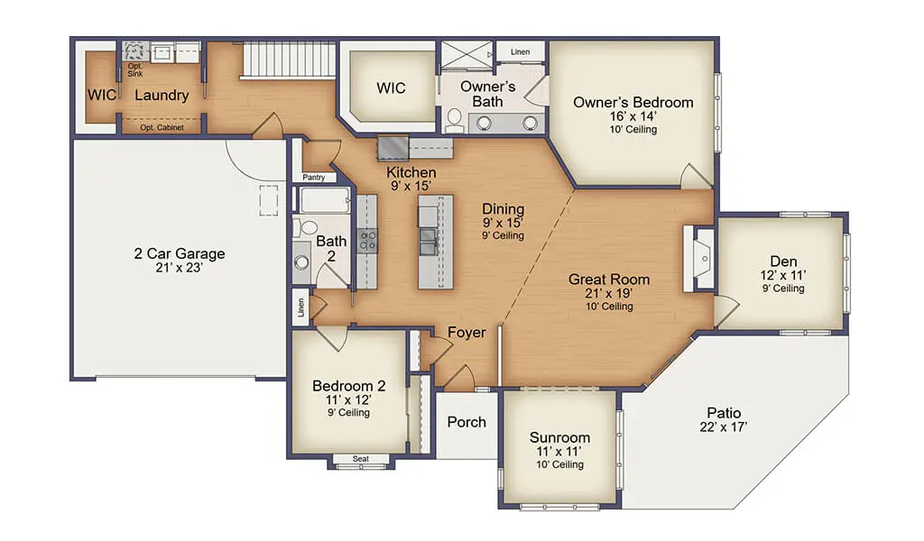 Enter the Tartan and you are immediately taken by the open, airy feel throughout the home. The living room, four-season sunroom, and den each feature high ceilings. Enjoy relaxing by a natural gas fireplace on chilly nights and cooking in your beautiful, spacious kitchen area with a breakfast counter.