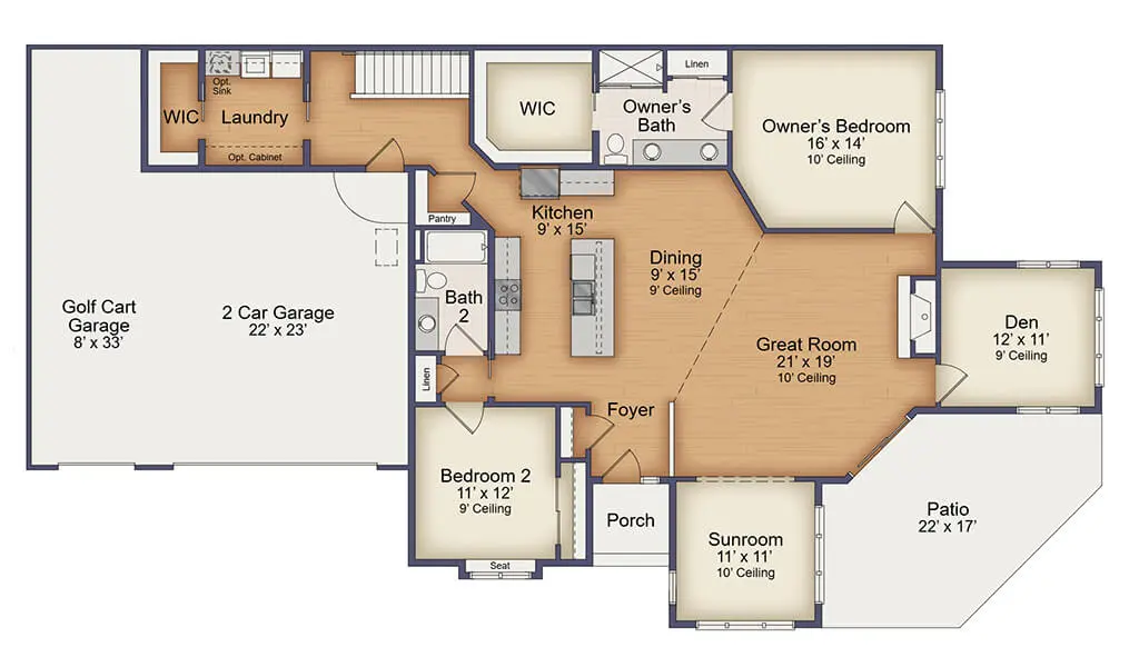 Enter the Tartan and you are immediately taken by the open, airy feel throughout the home. The living room, four-season sunroom, and den each feature high ceilings. Enjoy relaxing by a natural gas fireplace on chilly nights and cooking in your beautiful, spacious kitchen area with a breakfast counter.